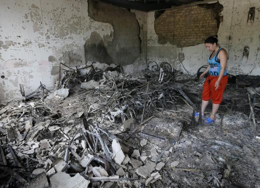Uma mulher está perto de escombros carbonizados em uma loja de bicicleta depois que os moradores dizem que foi bombardeios durante a noite pelas forças da Ucrânia, na cidade ucraniana oriental de Slaviansk 09 de junho de 2014.